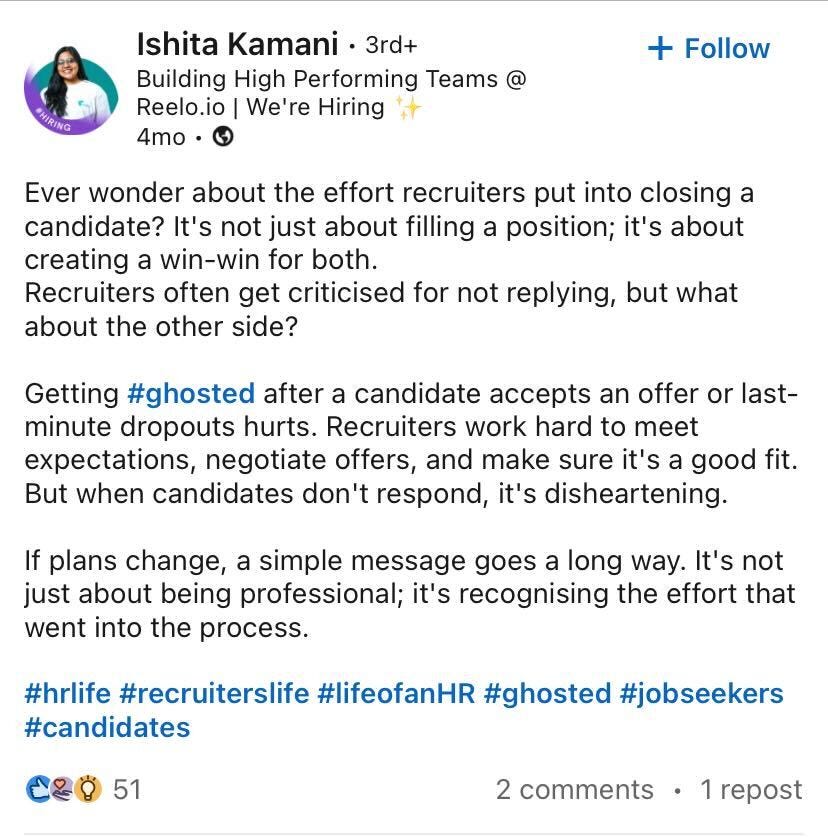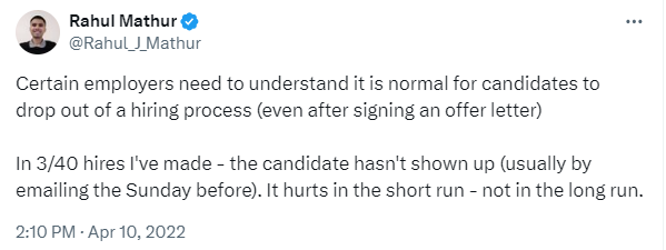 In Ajay’s personal experience, some other reasons why a candidate could dropout, or even worse, ‘ghost’ you could be: