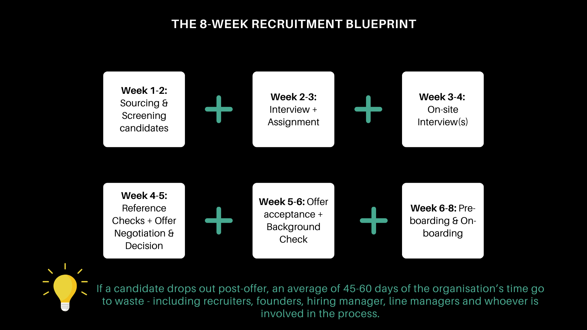 Candidates can drop out at any stage of the recruitment process, but all efforts — the recruiters’ time in sourcing, screening, and interviewing candidates — are equally in vain. To close a mid-level role, the recruitment process takes around 60 days, from the day of the client briefing to the day the candidate joins — and this is if you are lucky. The process might be delayed if there are multiple hiring managers, founders, core team members to go through.