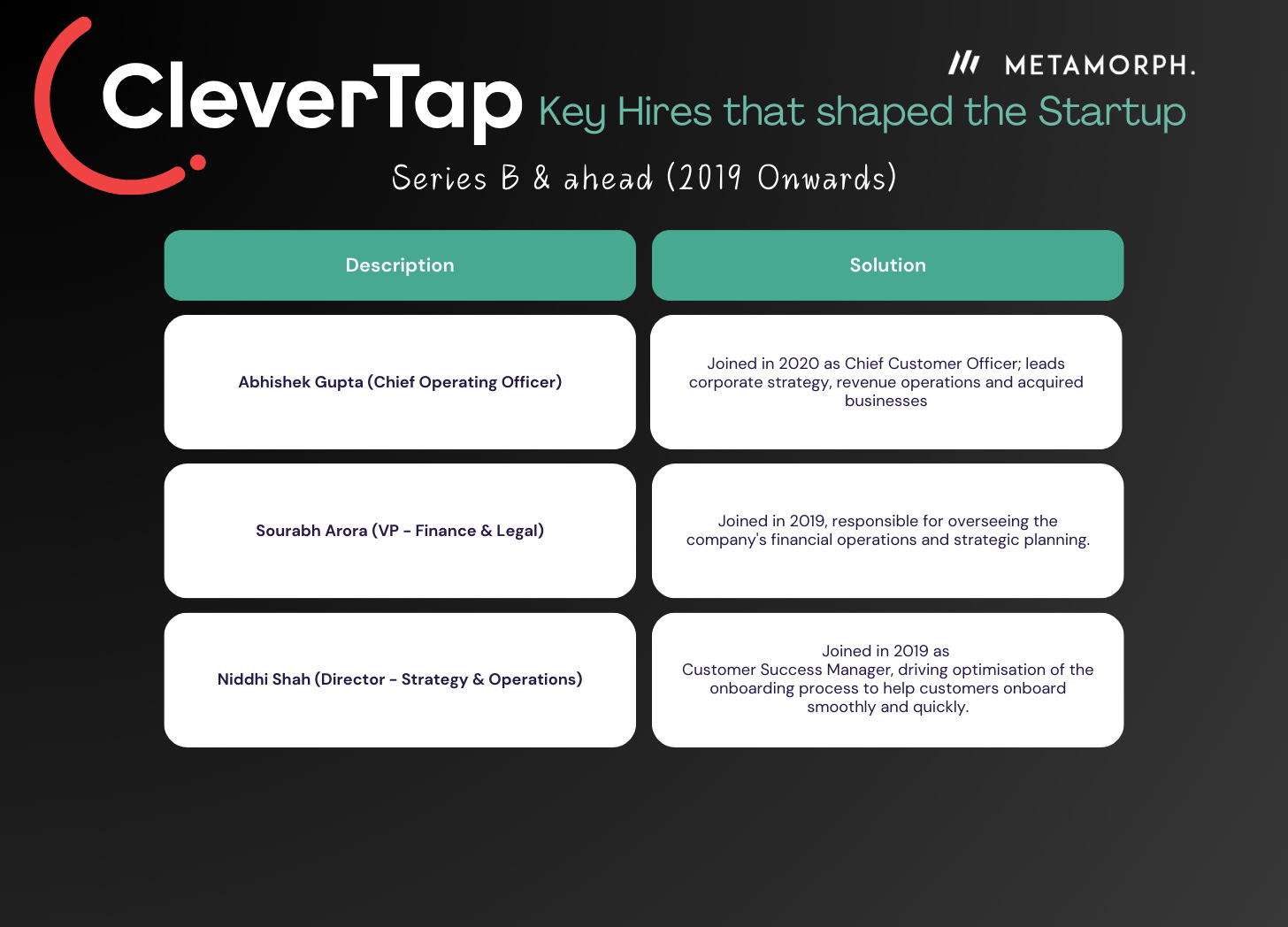 MetaMorph Insight: By Series B, the need for seasoned leaders becomes clear. We’ve observed Startups that invest in experienced C-suite hires like CFOs or legal counsel at this stage see more sustainable growth and smoother operations.